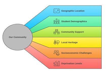 The surrounding areas of our school are recognised by the government to be more deprived than most neighbourhoods in England. Government data shows that only 8% of neighbourhoods in England are more deprived (ranked 2,835 out of 33,755 neighbourhoods).